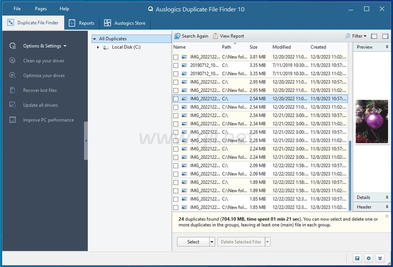 Auslogics Duplicate File Finder是一款可帮助用户快速查找和删除重复文件的工具软件。它可以帮助用户释放硬盘空间,提高电脑性能。