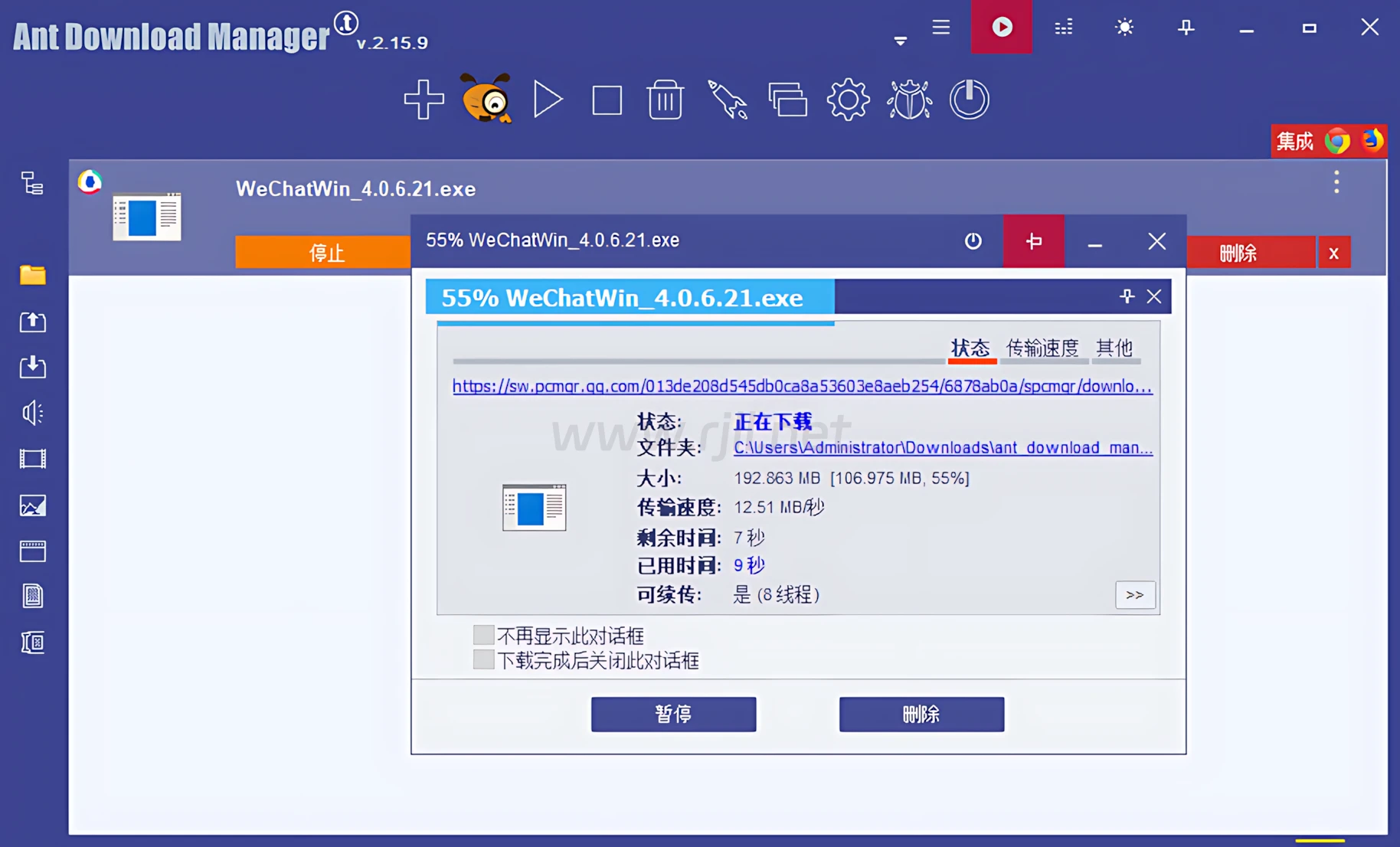 Ant Download Manager 是一款出色的下载工具,可从互联网上下载各类文件,极大地简化了从任何资源下载图片、视频、音乐、程序、文档等数据的过程。这款应用程序能很好地与所有流行的浏览器集成,比如谷歌浏览器及其基于相同内核的衍生浏览器(如 Yandex 浏览器、欧朋浏览器、Slimjet 浏览器等),还有火狐浏览器。该程序支持的下载范围相当广泛,从普通网站到安全网站(HTTPS)以及 FTP 服务器的资源都能下载。