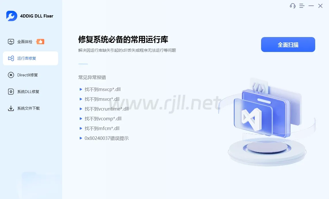修复系统错误:通过修复丢失或损坏的 DLL 文件,4DDiG DLL Fixer 能够有效解决诸如 “dll 文件缺失”、”应用程序无法启动” 等系统错误,帮助恢复应用程序的正常运行。