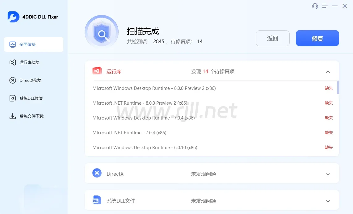 自动扫描和检测:4DDiG DLL Fixer 可以自动扫描系统,检测丢失或损坏的 DLL 文件。它会识别出哪些文件需要修复,并生成问题的详细列表。