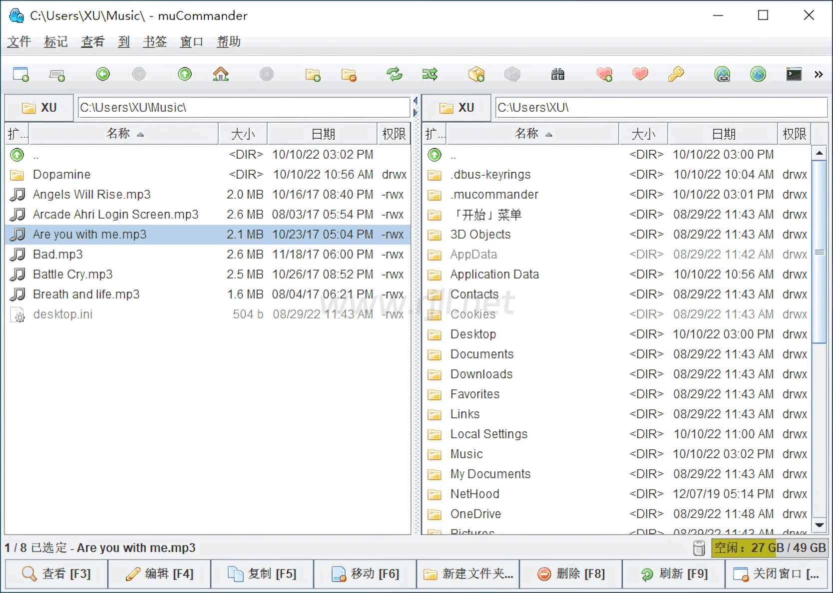 muCommander是一款跨平台的文件管理器,它以双窗口方式呈现文件和文件夹,并支持多种操作和快捷键,主要用于浏览、复制、移动、删除和重命名文件和文件夹等常规操作。