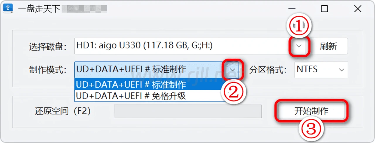 4、查看“选择磁盘”列表,保证选中的是正确的U盘。见图片001①。